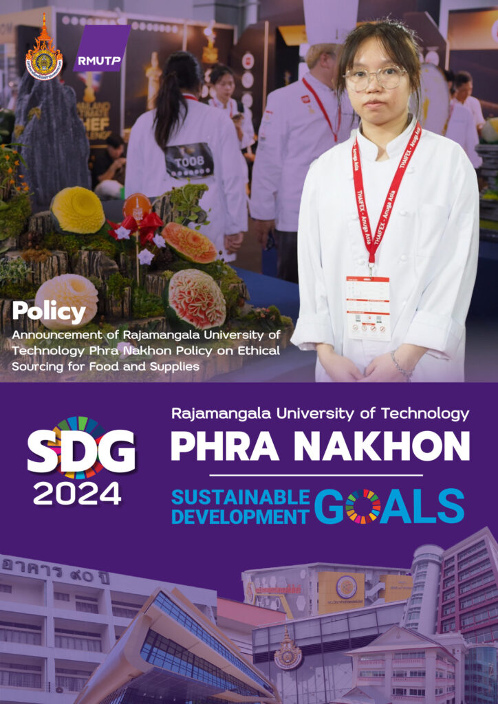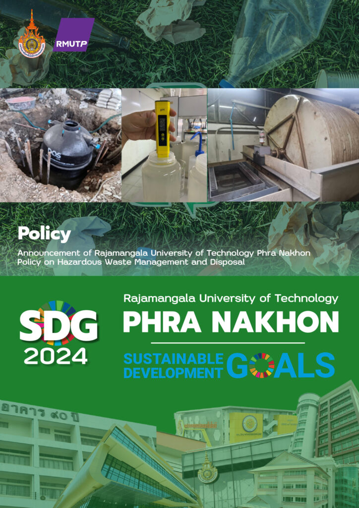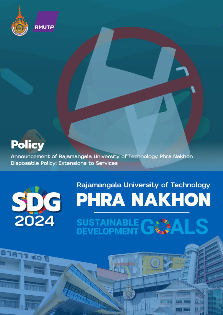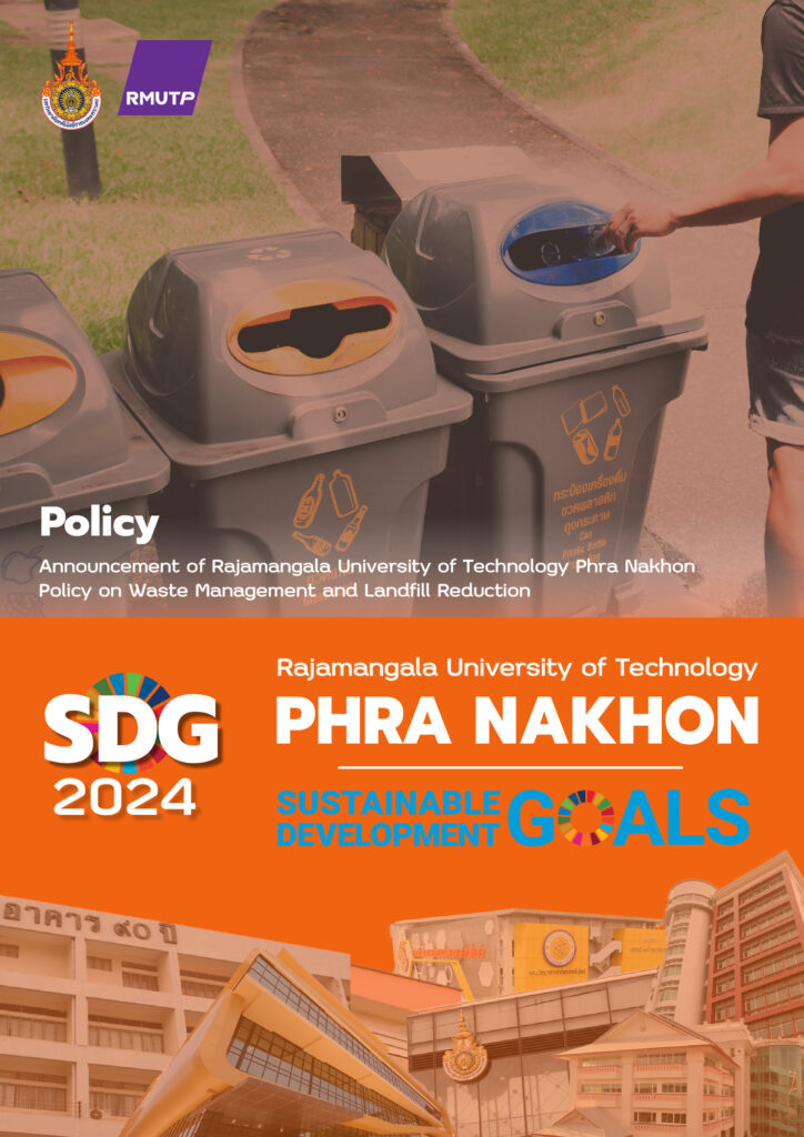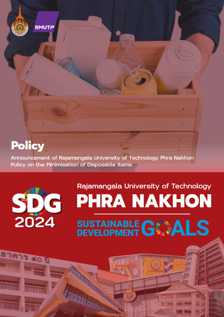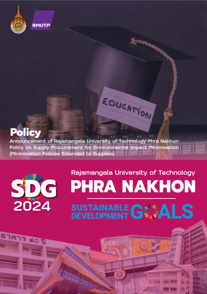 Policy Rajamangala University of Technology Phra Nakhon 2024 Policy on Ethical Sourcing for Food and Supplies Policy on Hazardous Waste Management and Disposal Policy on Waste Management and Landfill Reduction Policy on the Minimization of Plastic Use Policy on the Minimisation of Disposable Items Disposable Policy Extensions to Services Policy on the Minimization of Plastic Use 2023 Announcement of Rajamangala University of Technology Phra Nakhon: Measures to Assist Students Affected by the COVID-19 Pandemic Announcement of Rajamangala University of Technology Phra Nakhon: Policy on Becoming a Green University Regulations of Rajamangala University of Technology Phra Nakhon on Standards of Ethics to be Upheld within the University Announcement of Rajamangala University of Technology Phra Nakhon: Guidelines for Teaching and Learning 2022 Policy, criteria and procedures for admitting students with disabilities to study. Policy to protect nonsmoker’s health and designate specific smoking area. Regulation of RMUTP regarding the student development fund. Policy to human resources management and development. Regulation of RMUTP regarding human resource management for university employees.